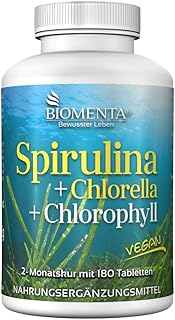 BIOMENTA Spiruline + Chlorelle + Chlorophylle - avec 1500 mg de poudre de spiruline + 1050 mg de Chlorella Vulgaris + 450 mg de Chlorella Pyrenoidosa / consommation quotidienne - 180 comprimés de spiruline vegan Chlorella